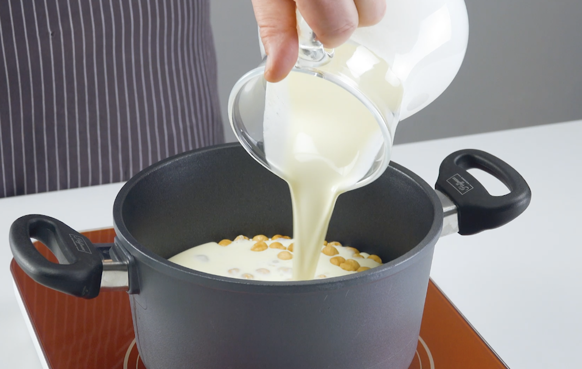 3. Gib geröstete Haselnüsse in einen Topf und gieße Sahne darüber. Erhitze alles auf ca. 70 °C. Schalte die Herdplatte aus und lass die Sahne mit den Nüssen noch ca. 15 Minuten ziehen.