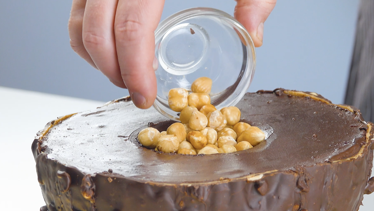 7. Übergieße die Halbkugeln mit der Nussschokolade und lass sie aushärten. Drehe die Halbkugeln um und fülle die Kuhlen in der Mitte mit Haselnüssen.