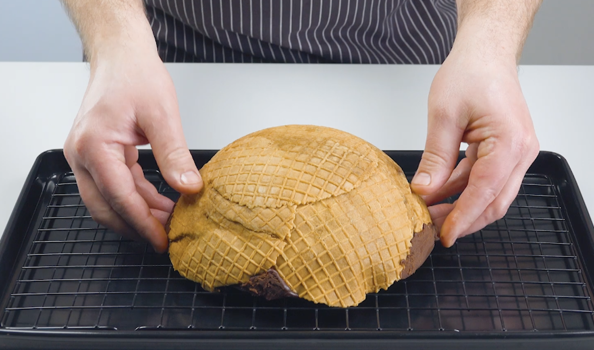 2. Hole die Waffeln aus dem Ofen und falte sie vorsichtig auseinander. Lege nun zwei Schüsseln mit den Eiswaffeln überlappend aus, sodass die Seiten und Böden mit ihnen bedeckt sind. Stelle die Schüsseln samt Waffeln nochmals für 5 Minuten in den Ofen, so werden die Waffeln wieder knusprig. Lass sie danach abkühlen.