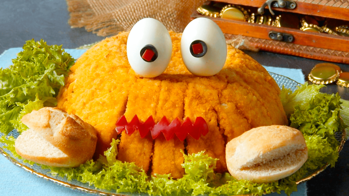 11. Dekoriere die Fischstäbchen-Kuppel nun mit Zahnstochern, Eiern, Oliven, Paprika, Brötchen und Salat zu einer niedlichen Krabbe.