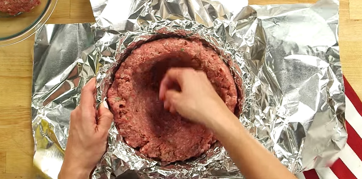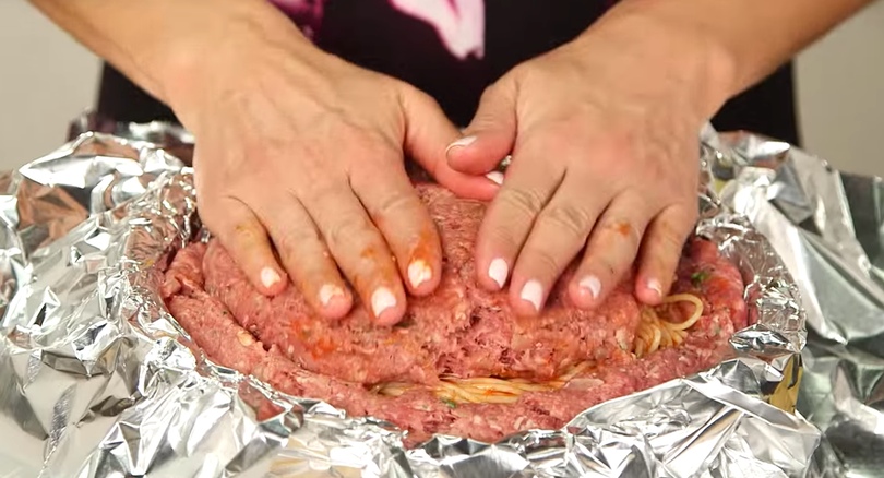 Als nächsten Schritt kleidest du eine ofengeeignete Schüssel mit Alufolie aus. hier kommen die restlichen zwei Drittel vom Fleisch hinein. Forme jetzt eine innere „Tasche“ im Fleisch – hier kommen die Nudeln hinein. Achte darauf, dass die die Seiten eher etwas dicker sind, sonst fällt vielleicht alles auseinander.