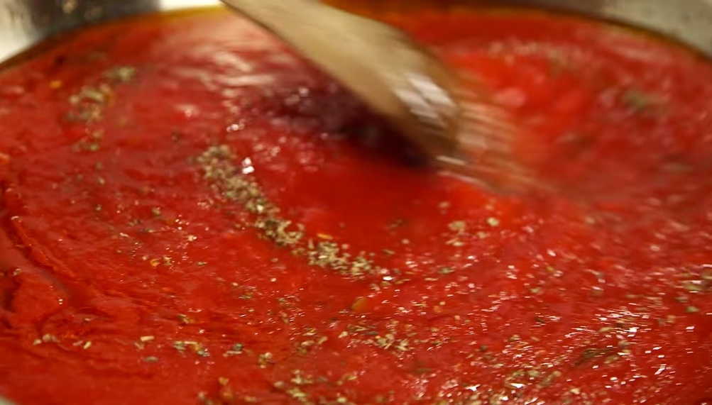 Als nächstes rührst du eine Marinade an. Dazu mischt du das Olivenöl, die Tomaten, Basilikum, Salz, Pfeffer und Oregano zusammen.