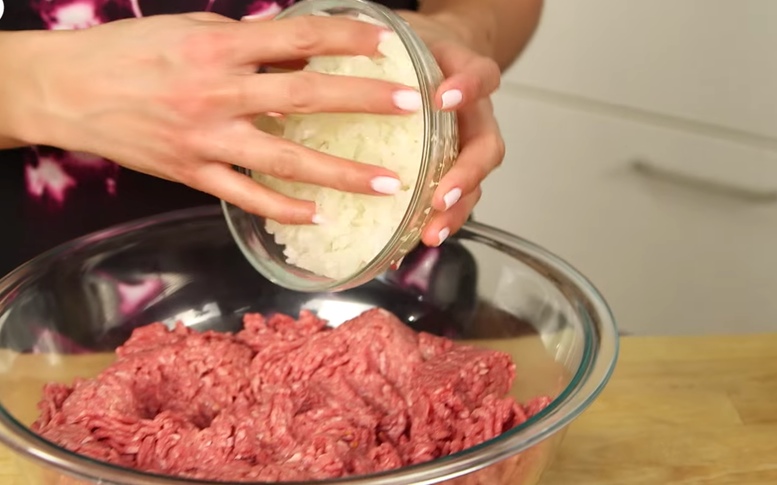 Jetzt ist es Zeit für die Frikadelle. Vermische in einer Schüssel das Hackfleisch mit den Zwiebeln, der Petersilie, den Eiern und dem Knoblauch.