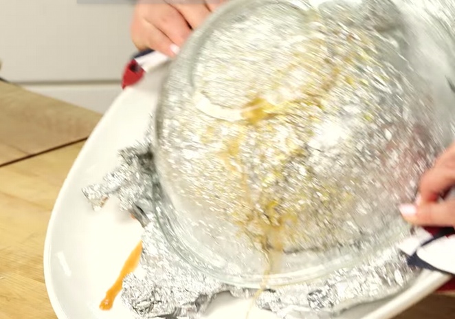 Nun solltest du den Ofen auf 180° vorheizen und die Oberseite mit Alufolie bedecken. Lass ganz oben ein kleines Loch, damit ein wenig von der Hitze abziehen kann.