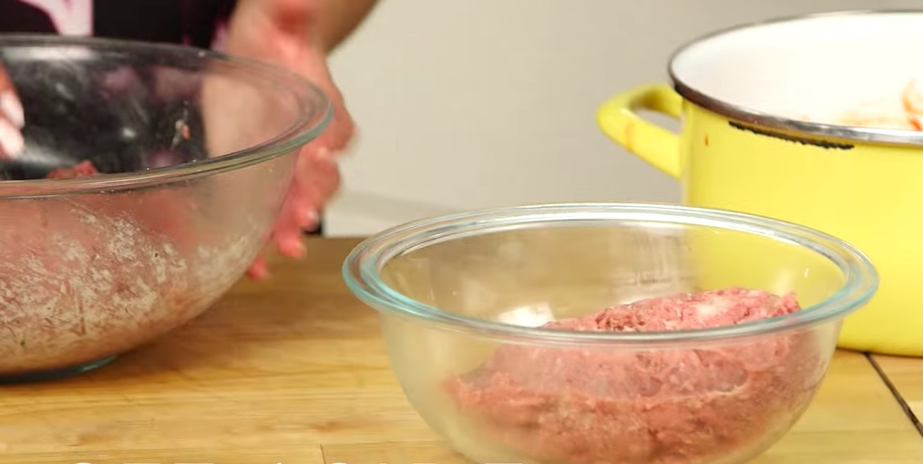 Wenn alles gut untergehoben ist, stellst du ein Drittel vom Fleisch zur Seite.