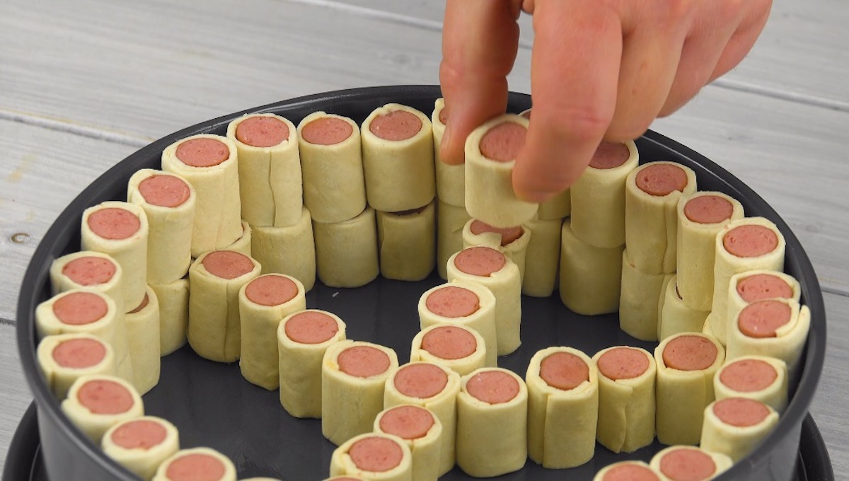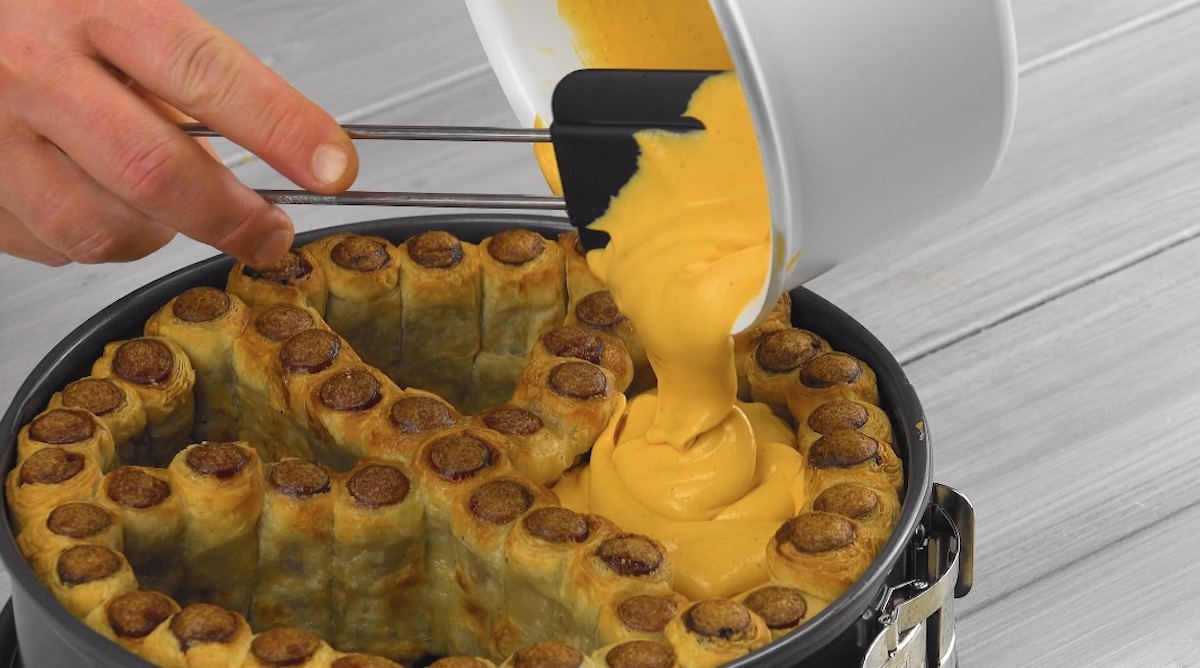 3.) Fette nun eine Springform ein und stelle die Würstchenstücke im Teigmantel in 2er-Stapeln in Form eines Peace-Zeichens hinein. Decke die Form anschließend noch mit Alufolie ab. Dann kommt sie bei 180 °C Umluft erst einmal für 60 Minuten in den Ofen. Hole die Form heraus, entferne die Alufolie und backe die Würstchen erneut für ca. 30 Minuten.