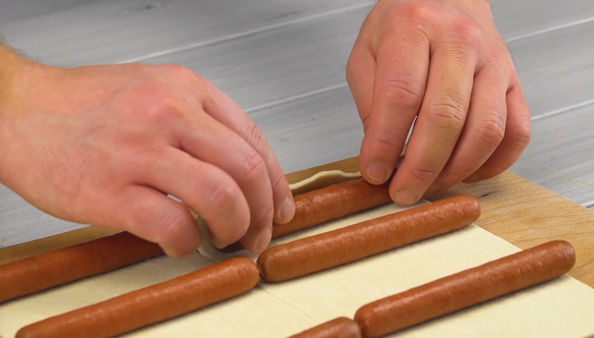 1.) Rolle den fertigen Blätterteig aus und platziere darauf sechs Würstchen (drei Reihen à zwei Stück nebeneinander). Schneide mit einem Pizzaroller oder einem Messer sechs Rechtecke um die Würstchen herum aus und rolle diese danach in den Teig ein.