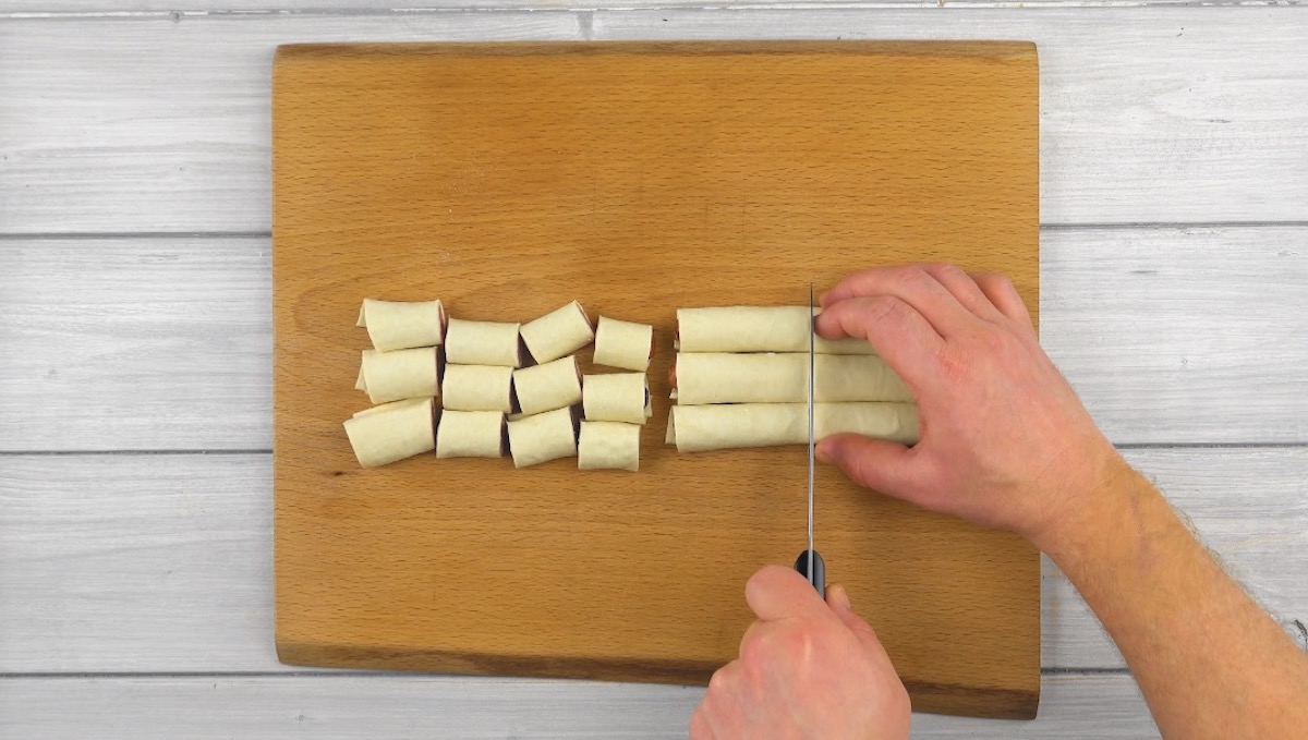 2.) Schneide die eingerollten Würstchen in vier gleich große Stücke. Wiederhole dieses Prozedere mit den restlichen drei Blätterteigrollen und 18 Würstchen.