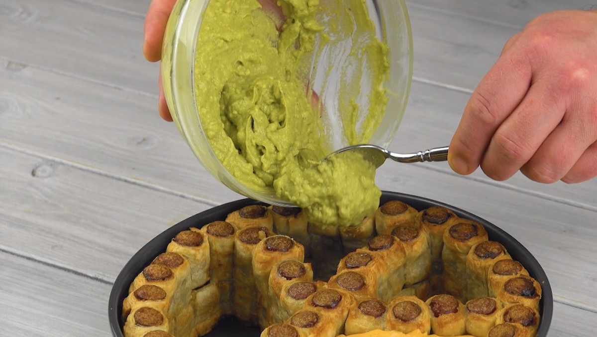 5.) Für die Guacamole halbierst du die Avocados und holst das Fruchtfleisch mit einem Löffel heraus. Zerkleinere es mit einer Gabel in einer Schüssel. Gib den Joghurt, klein gehackten Knoblauch und den Saft einer Zitrone hinzu und würze alles mit Salz und Pfeffer. Vermische alles zu einer glatten Creme und fülle diese in die zweite der vier Kammern des Peace-Kuchens.