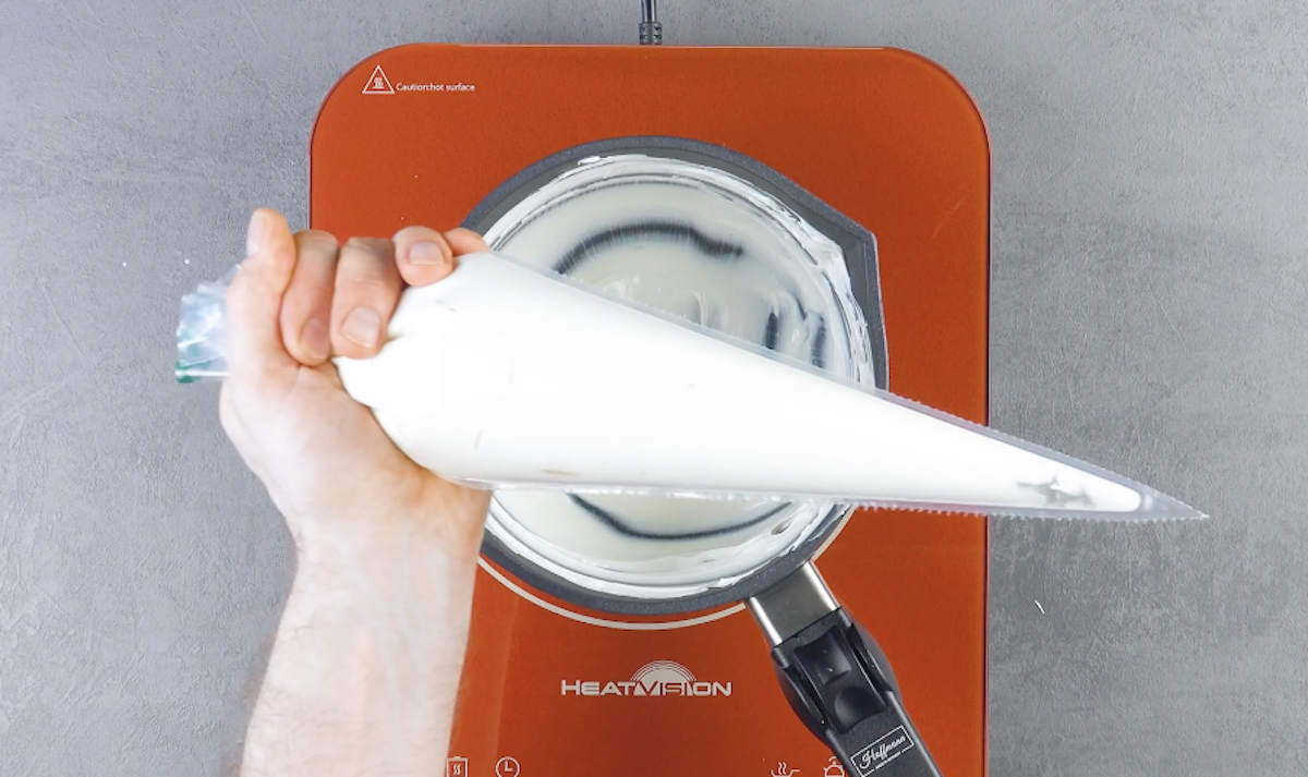 3. Koche Kokosmilch mit Ananassaft auf und füge die gehackte weiße Schokolade hinzu. Lass diese schmelzen und vermische alles gut miteinander. Lass alles auf Raumtemperatur abkühlen und hebe dann zum Schluss vorsichtig geschlagene Sahne unter. Fülle die Kokoscreme in einen Spritzbeutel und lass sie nochmals durchkühlen.