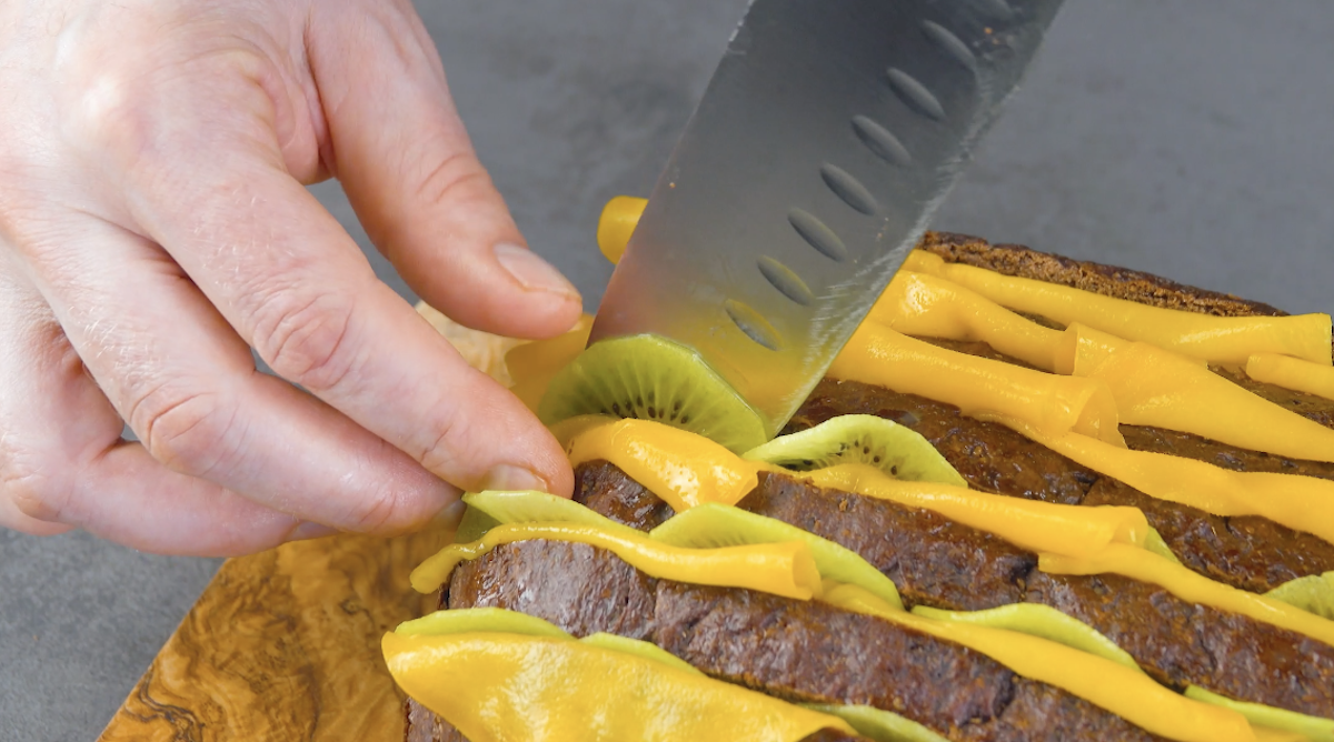 5. Schneide die Mangos und die Kiwis in dünne Scheiben und fülle mit ihnen die Spalten im Kuchen.
