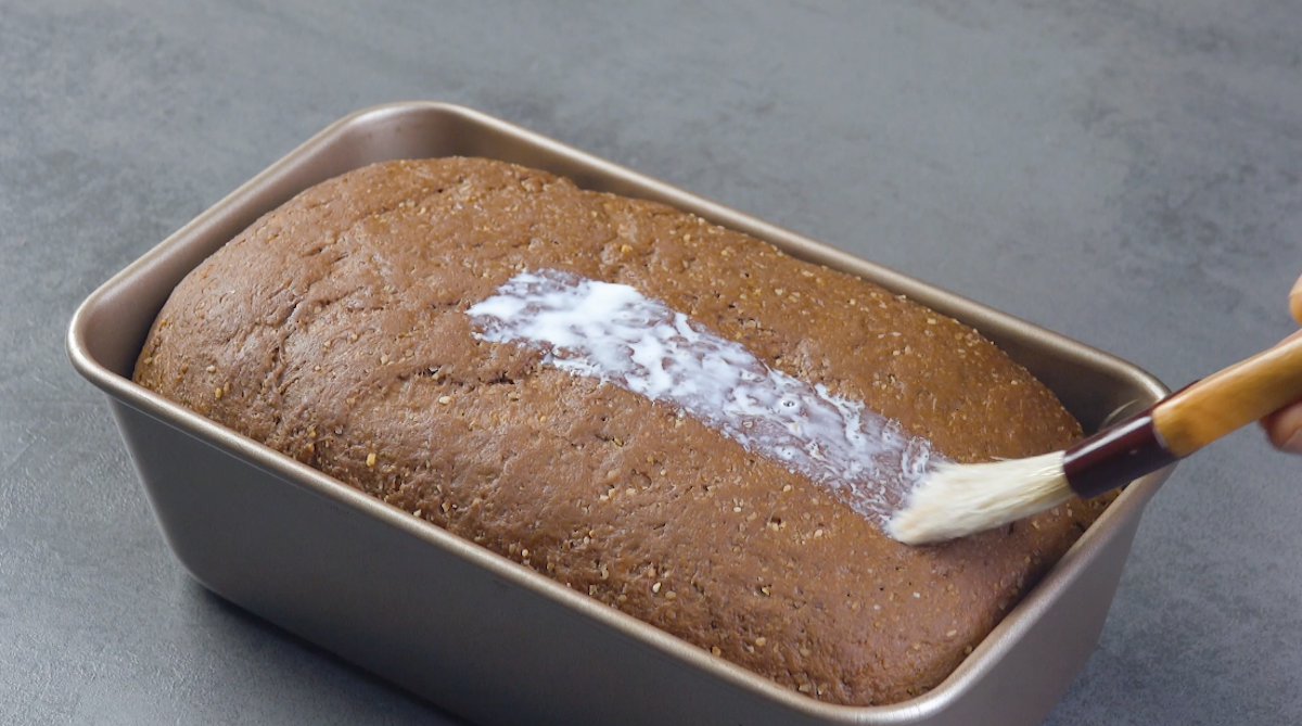 2. Lege den Boden einer Kastenform mit Backpapier aus. Knete den Teig nach der Gehzeit noch einmal durch und lege ihn in die Kastenform. Decke die Form mit Frischhaltefolie ab und lass den Teig ca. 2 Stunden bei Raumtemperatur gehen. Pinsle den Teig in der Form mit Milch ein und schiebe ihn bei 170 °C Ober- und Unterhitze für 60 Minuten in den Ofen. Nach dem Backen löst du den Kuchen aus der Form und lässt ihn vollständig abkühlen.
