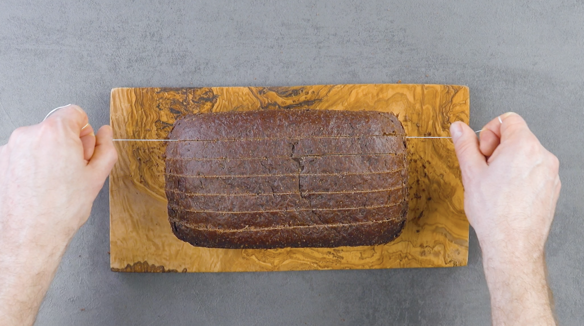 4. Schneide den Kuchen längs mit Zahnseide ein, schneide ihn aber NICHT durch.