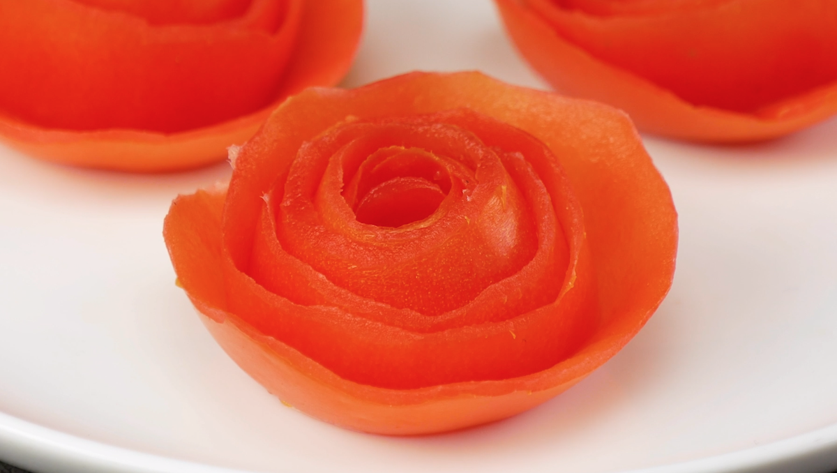 Aus vermeintlichem „Abfall“ kann man hübsche Deko für den Teller kreieren. Wie zum Beispiel eine Rose aus einer Tomatenschale.