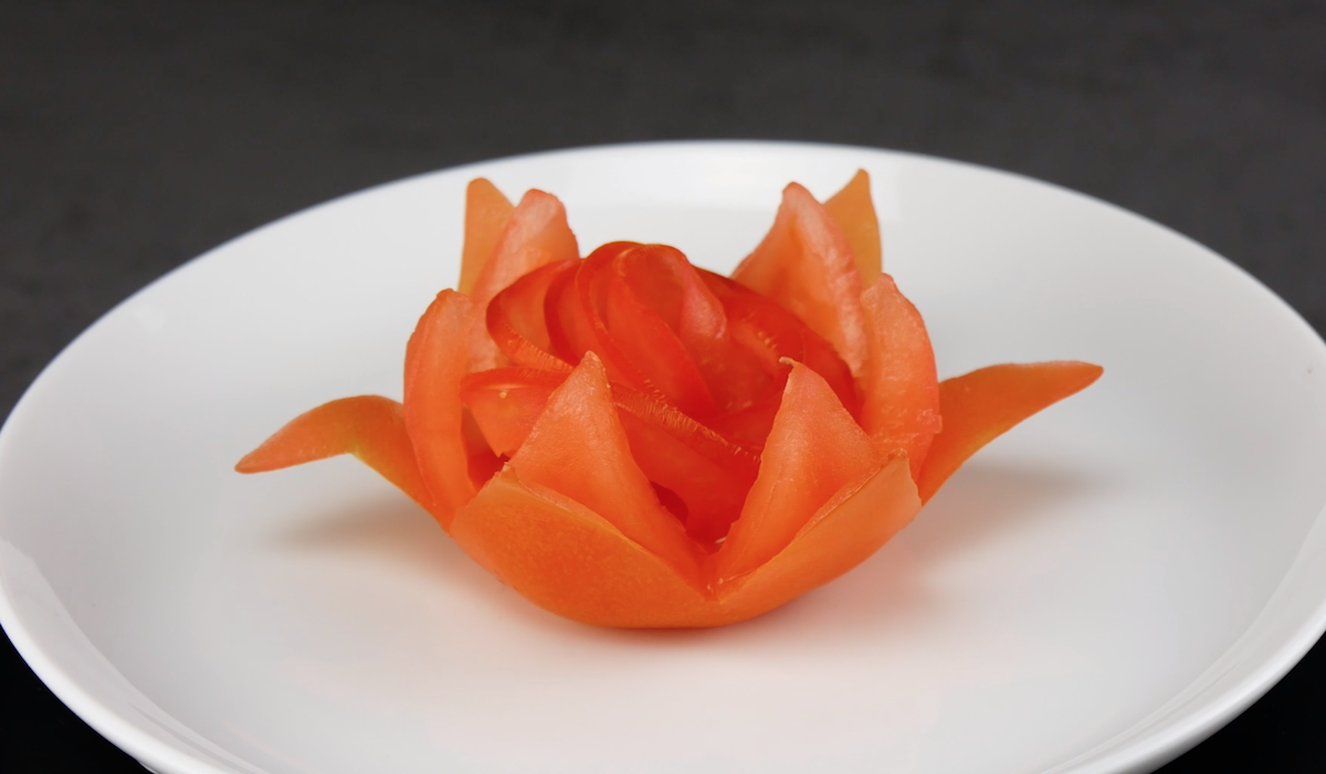 So genanntes „Food Carving“ bezeichnet die künstlerische Bearbeitung von Obst oder Gemüse mit einem Messer. Auf Deutsch also: Obst oder Gemüse schnitzen. In Thailand lernen Kinder Food Carving sogar in der Schule. Das liegt vor allem daran, dass früher diese geschnitzten Kunstwerke die Tische der thailändischen Königsfamilie schmückten. Mittlerweile ist aus dieser alten Tradition eine moderne Kunst geworden. Wir zeigen euch, wie schnell man aus Tomaten kleine Kunstwerke schnitzt.