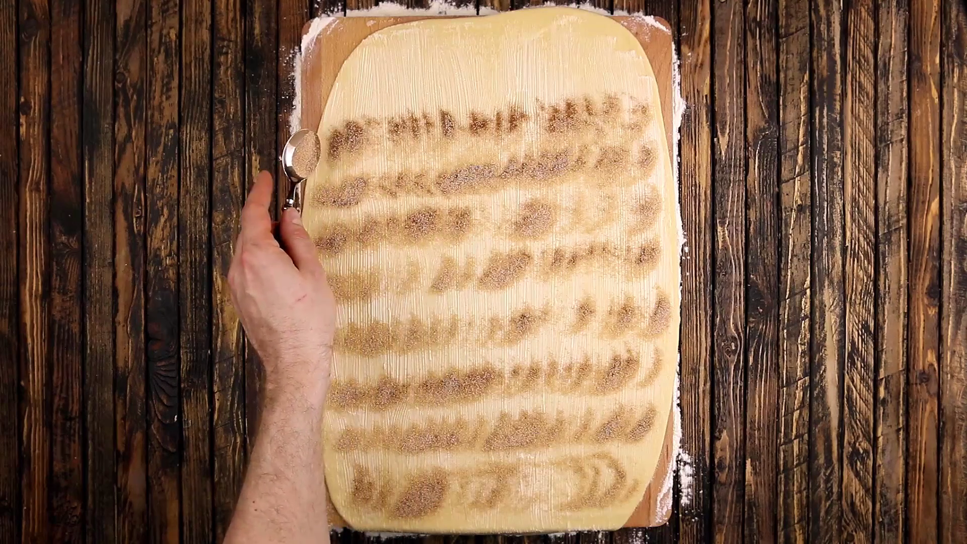 Streue die Zucker-Zimt-Mischung darauf und rolle den Teig zusammen.