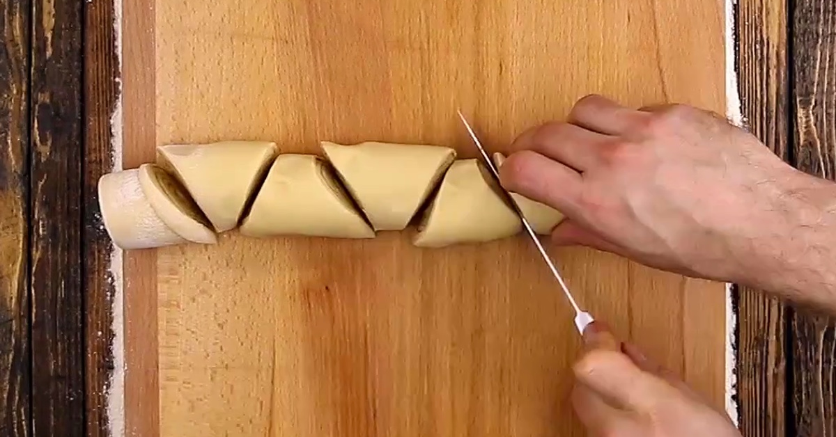 Um die Franzbrötchen in Form zu bringen, schneidest du im wechselnden 45°-Winkel sechs Stücke (Portionen) von der Rolle. Ein fertiges Stück sollte wie ein Trapez aussehen.