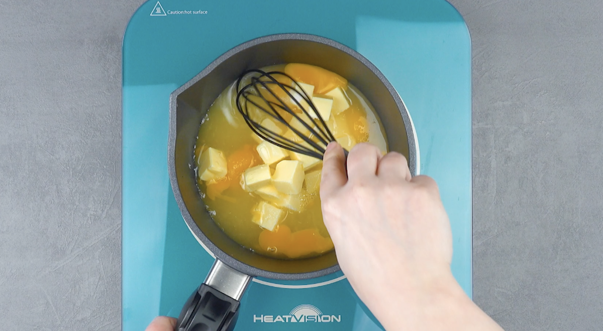 5. Gib Zucker, weiche Butter, Eigelb, Zitronensaft und Salz in einen Topf und erhitze alles unter ständigem Rühren. Verrühre alles so lange, bis die Lemon Curd fest und cremig ist. Nimm sie dann vom Herd und lass sie abkühlen.
