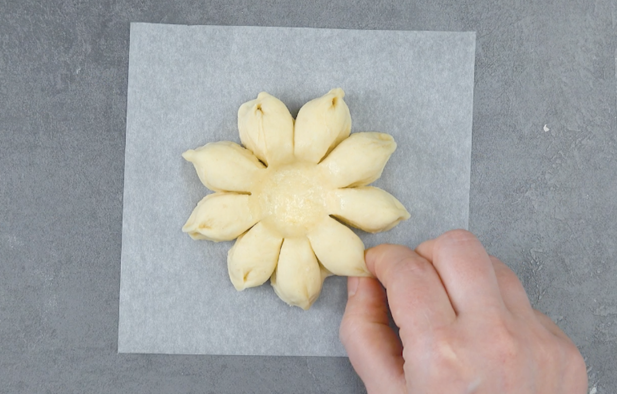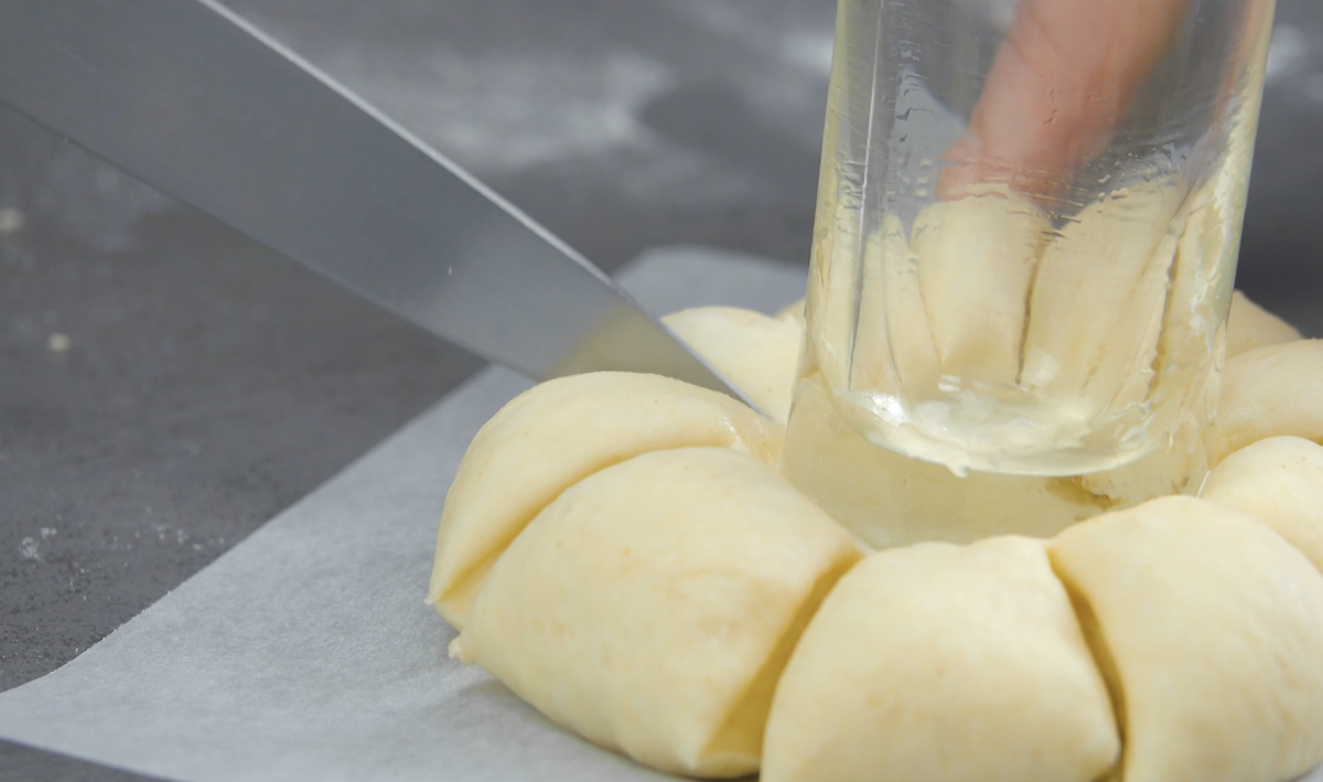 4. Entferne das Glas und drücke die Enden des eingeschnittenen Teigs zu Spitzen zusammen.