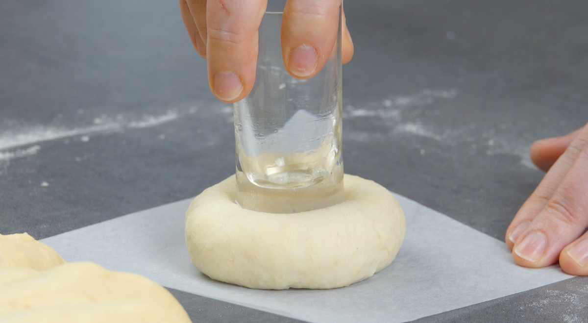2. Teile den Teig in ca. 12 Stücke und forme diese zu kleinen Kugeln. Lege nun eine Teigkugel auf ein Stück Backpapier und drücke ein eingefettetes Glas in ihre Mitte.