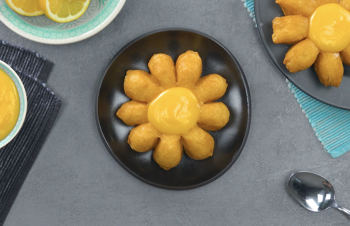 6. Backe die Blumen aus Hefeteig in heißem Fett aus und lass sie dann auf einem Papiertuch abtropfen. Gib dann je einen Löffel Lemon Curd in die Mitte der Teigbumen.