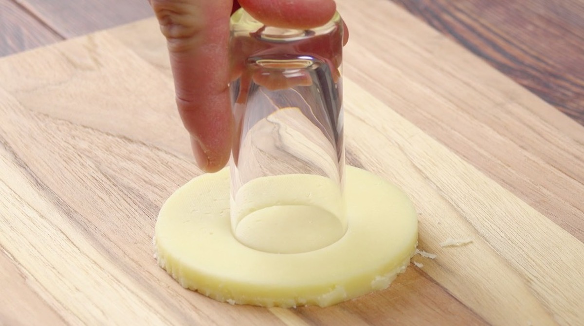 2.) Im zweiten Schritt stichst du mit einem Glas oder einer kleinen Schüssel Kreise aus fingerdicken Käsescheiben aus. Mit einem Schnapsglas kriegst du das Loch in der Mitte ausgestanzt, sodass du Käseringe erhältst.