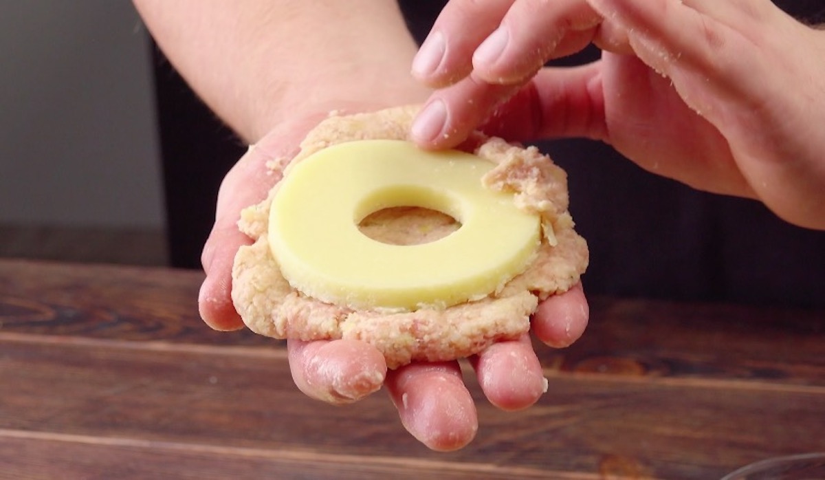 3.) Nimm dir etwas Hackfleisch auf die Hand und lege den Käsering darauf. Dann ummantelst du den Käse rundherum mit der Hackfleischmasse. Für die knusprige Panade legst du den herzhaften Donut in das Pankomehl. Jetzt können die Donuts in der Pfanne frittiert werden.