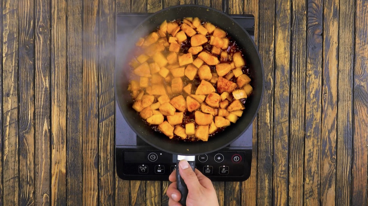 3.) Füge nun Ananaswürfel, Honig, Sojasoße und Sweet Chili Soße hinzu. Die Pfanne sollte so lange kochen, bis die Soße eingekocht ist.