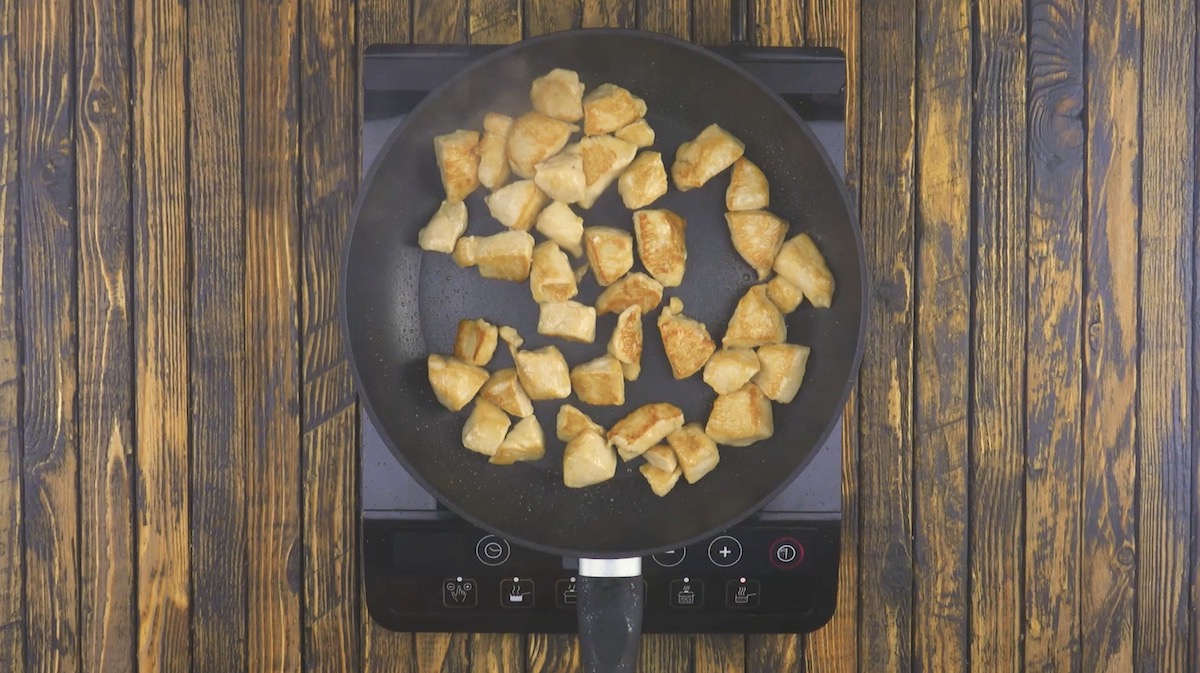 2.) Schneide die Hähnchenbrust in Würfel und mische diese mit Stärke, Sojasoße und Wasser. Erhitze etwas Öl in einer Pfanne und brate die Hähnchenwürfel leicht braun an.