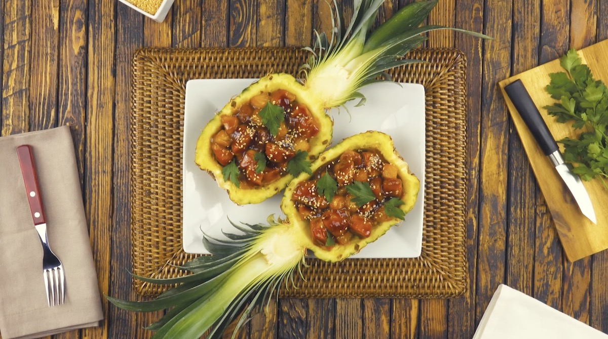 Fruchtig, saftig, deftig und süß-sauer: Die volle Palette Aromen bietet die Ananas für zwei. Serviert in witzigen Einweg-Tellern der anderen Art, kommt nicht nur das Urlaubsgefühl, sondern auch gute Laune auf. Schade, dass man die Ananas nicht einfach wie jeden anderen Teller abwaschen kann. Doch dafür genießt man das exotische Mahl umso mehr.