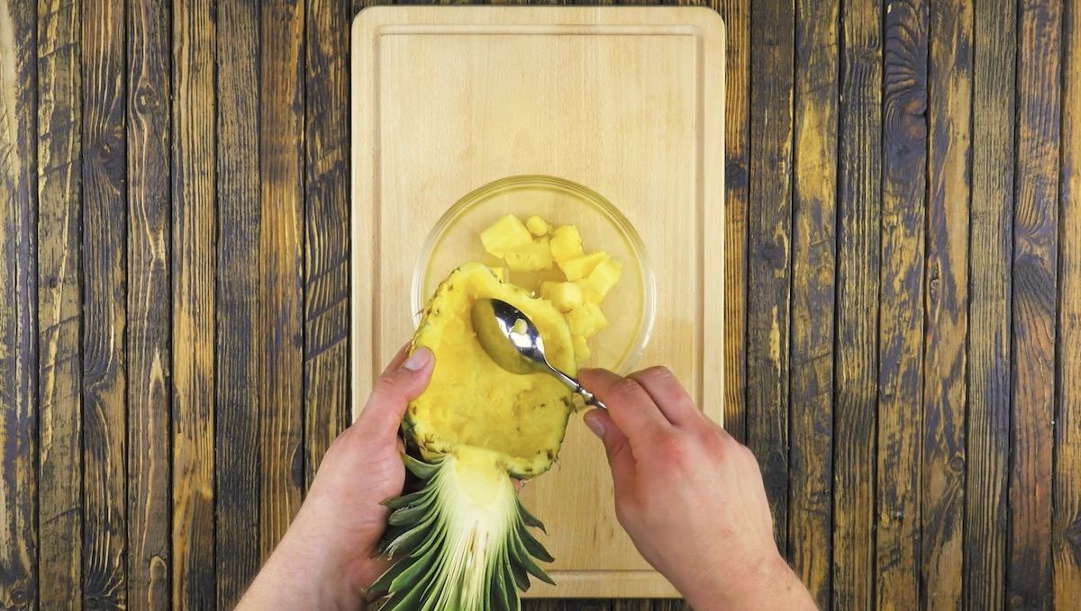 1.) Halbiere die Ananas längs inklusive Strunk. Schneide ihr Inneres kreuzweise ein und entferne das nun gestückelte Fruchtfleisch.