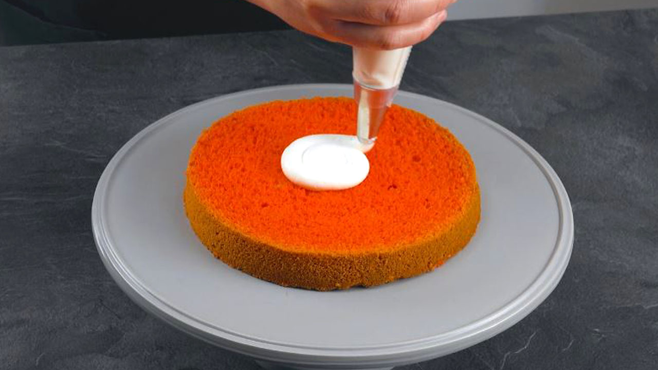 7. Als Abschluss kommt ein weiterer Tortenboden obendrauf. Streiche den gesamten Kuchen dann rundherum mit der restlichen Frischkäse-Creme ein.