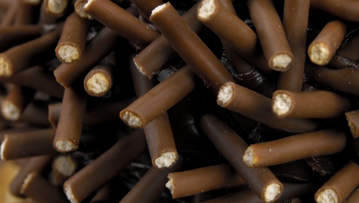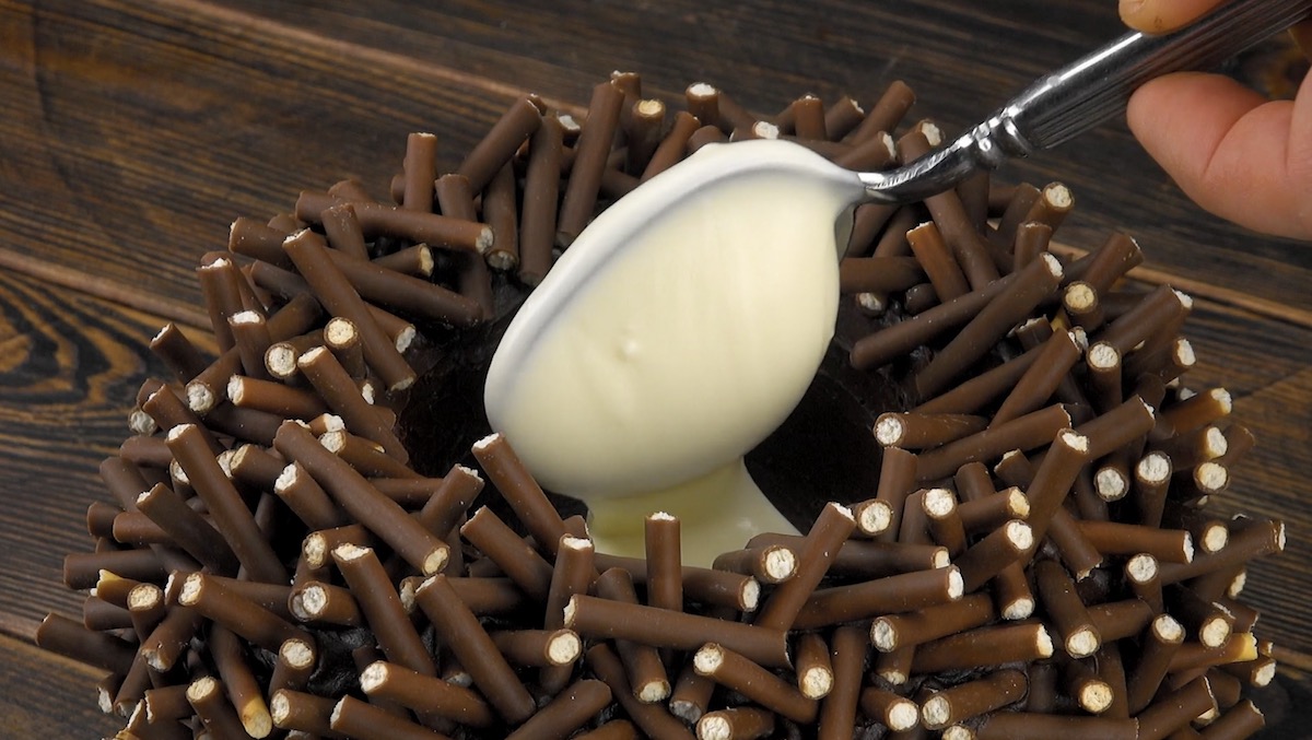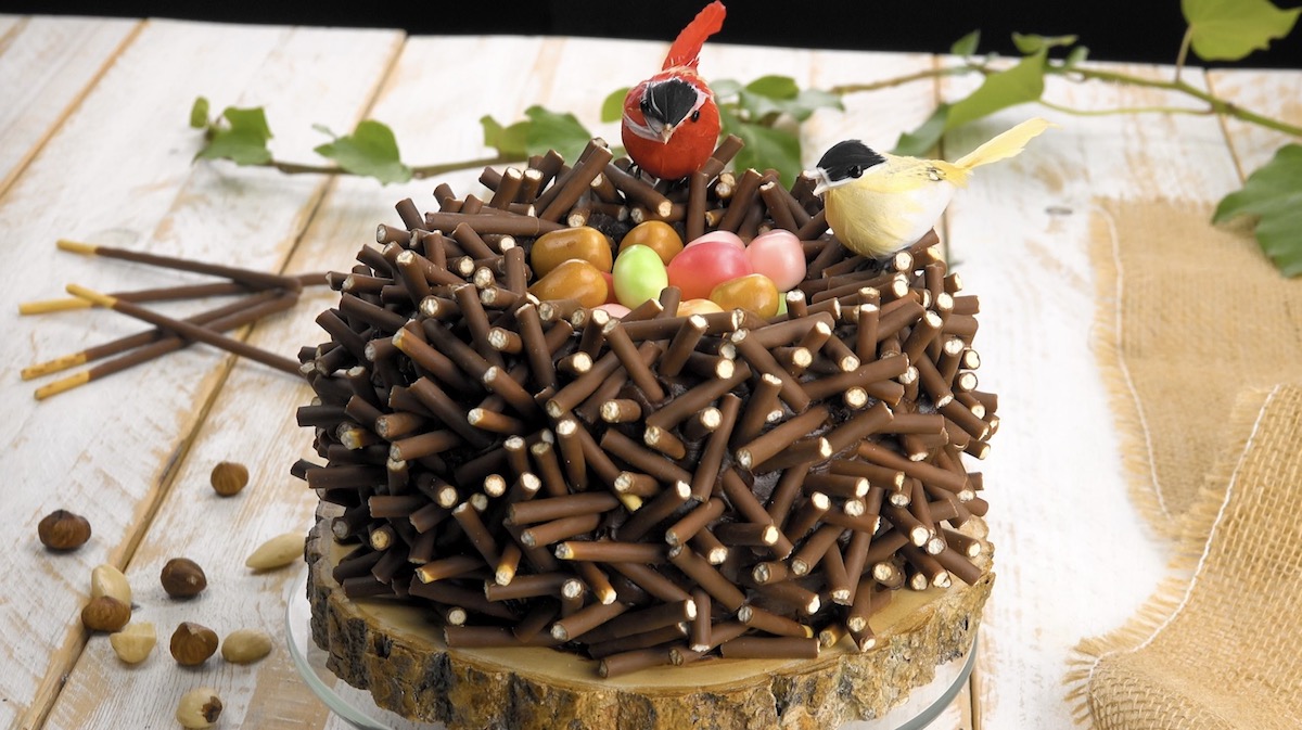 6.) Zerbrich Mikado-Stäbchen in etwa drei Zentimeter lange Stücke und stecke sie von außen so in den Kuchen, sodass sie aussehen wie kleine Holzstöcke eines Vogelnestes.