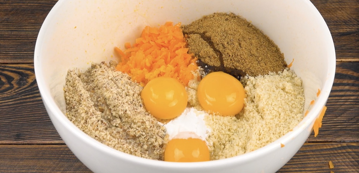 2.) Gib nun braunen Zucker, gemahlene Mandeln, Haselnüsse, Backpulver und Öl hinzu. Trenne drei Eier und gib die Eigelbe ebenfalls dazu.