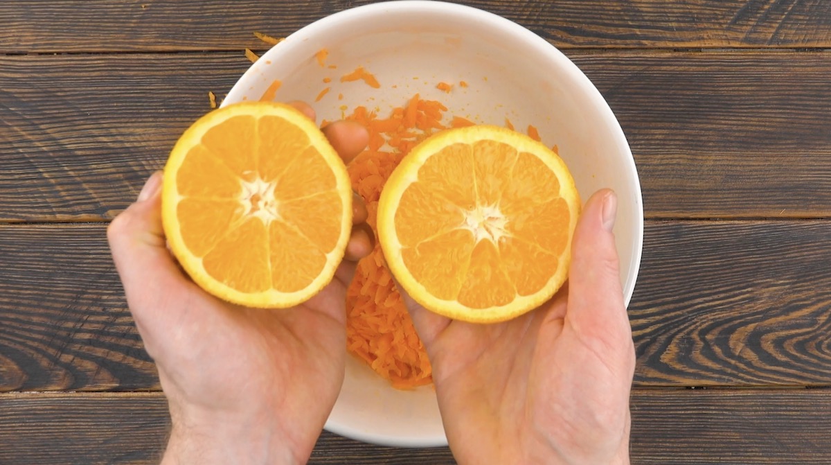 1.) Reibe für den Teig als Erstes eine geschälte Möhre und die Schale einer Orange. Halbiere danach die Orange und presse den Saft hinzu.