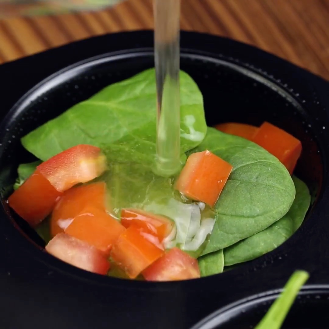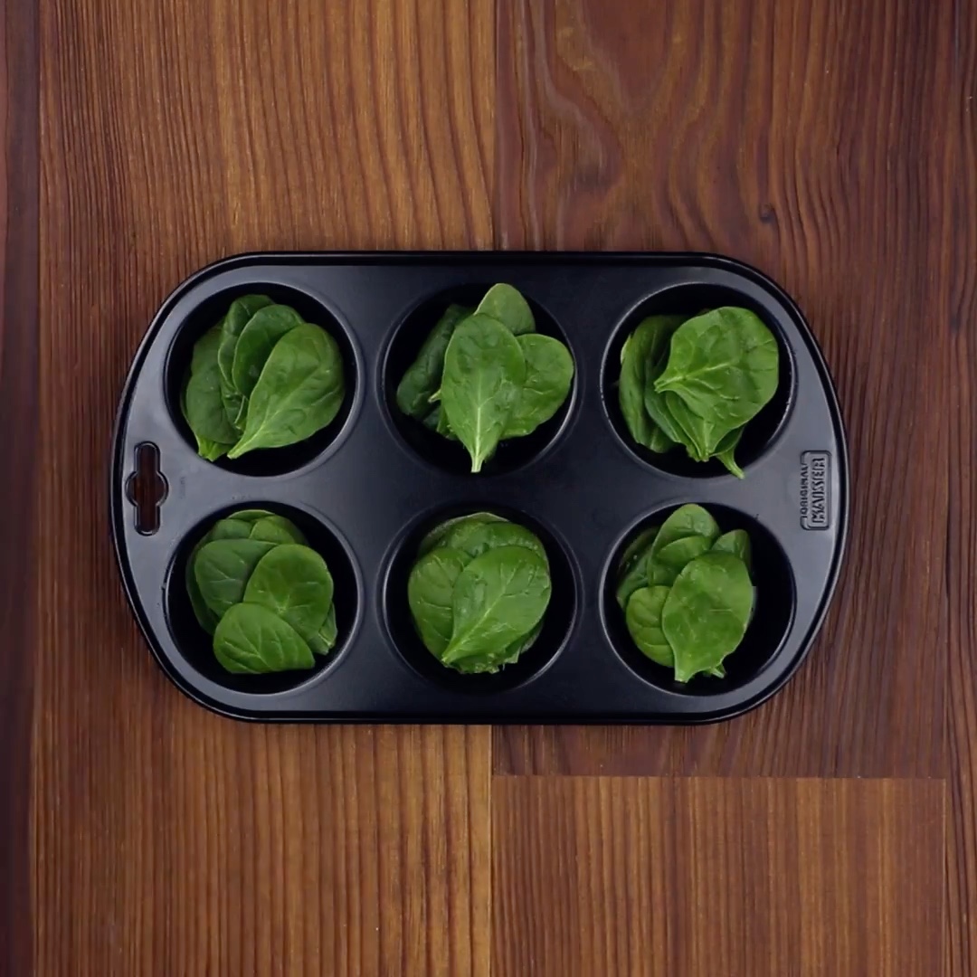 Streiche die Muffinform mit Öl aus. Gib nun in jede Mulde einige Blätter Spinat und darauf Tomatenwürfel.