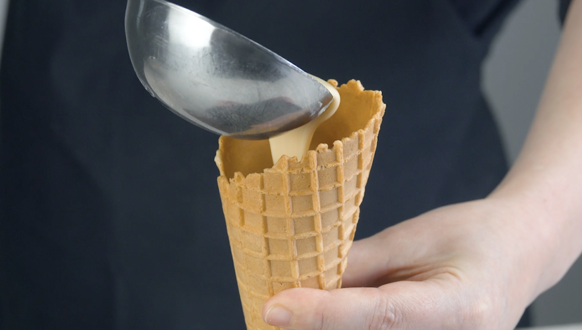 2. Erhitze Fett in einer Pfanne auf ca. 160 °C. Schneide den unteren Teil eines Waffelhörnchens ab. Halte das Loch mit deinem Finger zu und fülle die Waffel mit Teig.