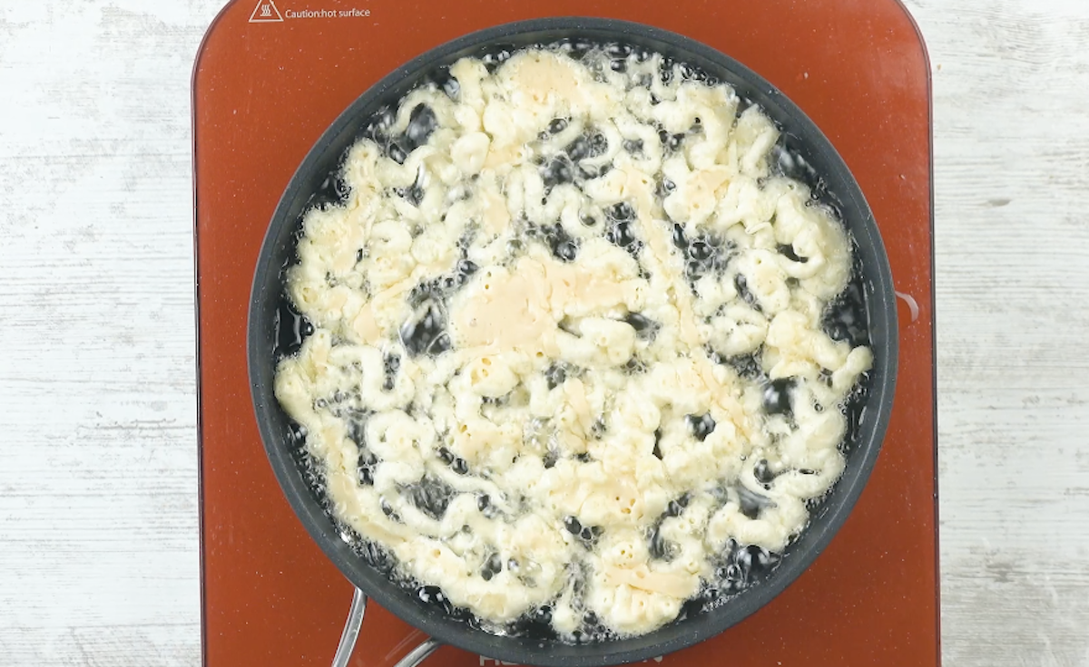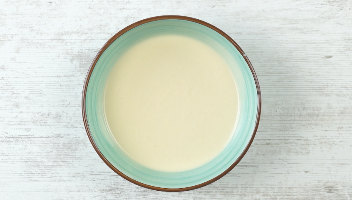 1. Reibe essbare Kreide in ein Gefäß und gib das Wasser hinzu. So entsteht Kalkwasser und der Teig wird später extra kross. Vermische das Kalkwasser nun mit Mehl, Milch, Ei, Zucker, Backpulver und einer Prise Salz und verrühre alles zu einem glatten Teig.