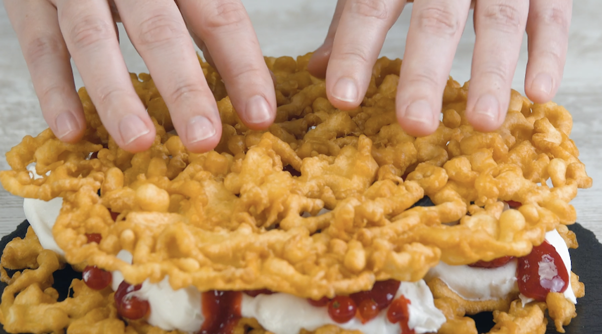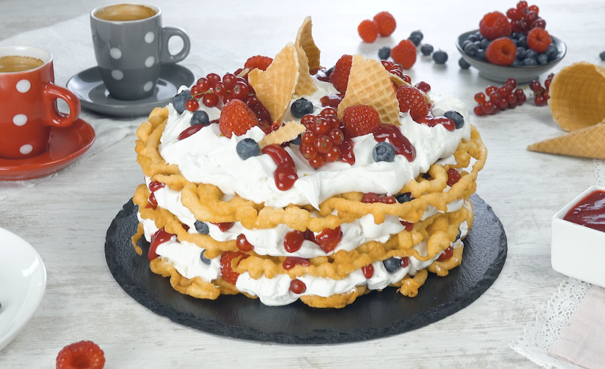 Auf amerikanischen Volksfesten schon lange ein beliebter Klassiker: der Funnel Cake. Der Funnel Cake ist ein frittiertes Schmalzgebäck, welches traditionell mit Puderzucker serviert wird. Eigentlich wird der Teig durch einen Trichter in heißes Fett gegossen und dann goldbraun frittiert. Wir benutzen als Trichter eine Eiswaffel, die man zum Schluss noch als Dekoration nutzen kann. Außerdem schichten wir 3 Funnel Cakes abwechselnd mit einer erfrischenden Kokoscreme und frischen Beeren.