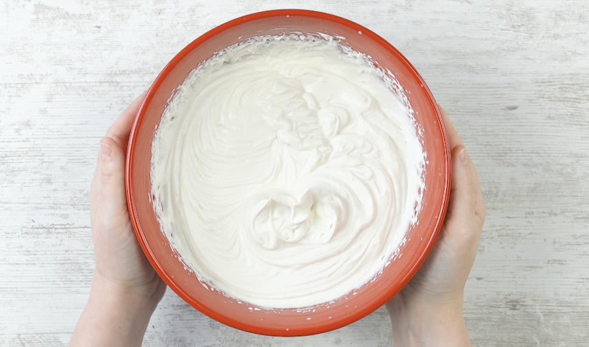 4. Schlage die Kokosmilch mit Puderzucker, dem Abrieb einer Limette, Sahne sowie einer Packung San-apart steif.