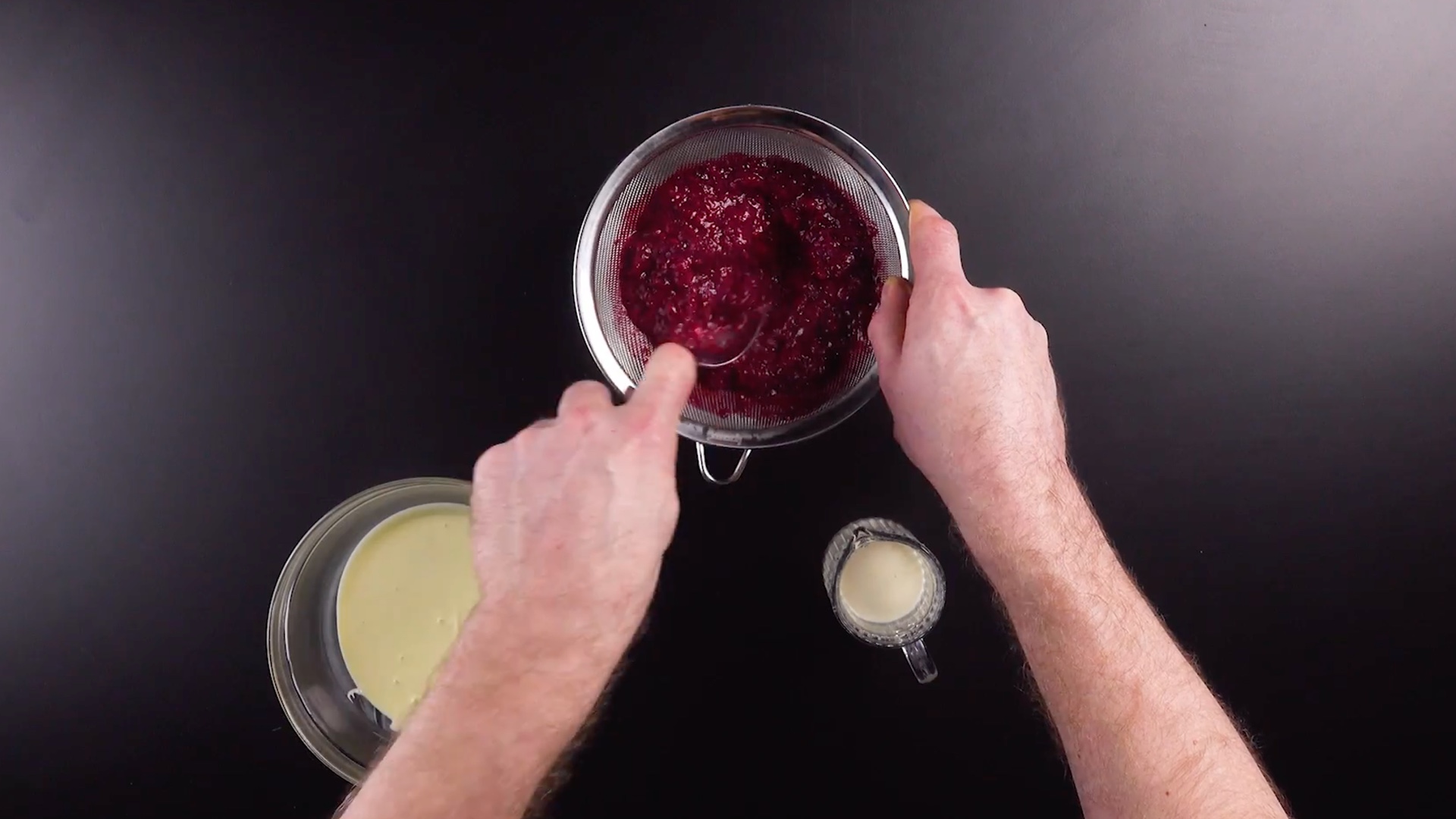 6.) Koche die Brombeeren ein und streiche sie durch ein Sieb. Rühre sowohl die Sahne als auch die flüssige Schokolade unter das Brombeerpüree und stelle es  30 Minuten kalt. Danach schlage es zu einer luftigen Creme mit dem Handrührgerät auf.