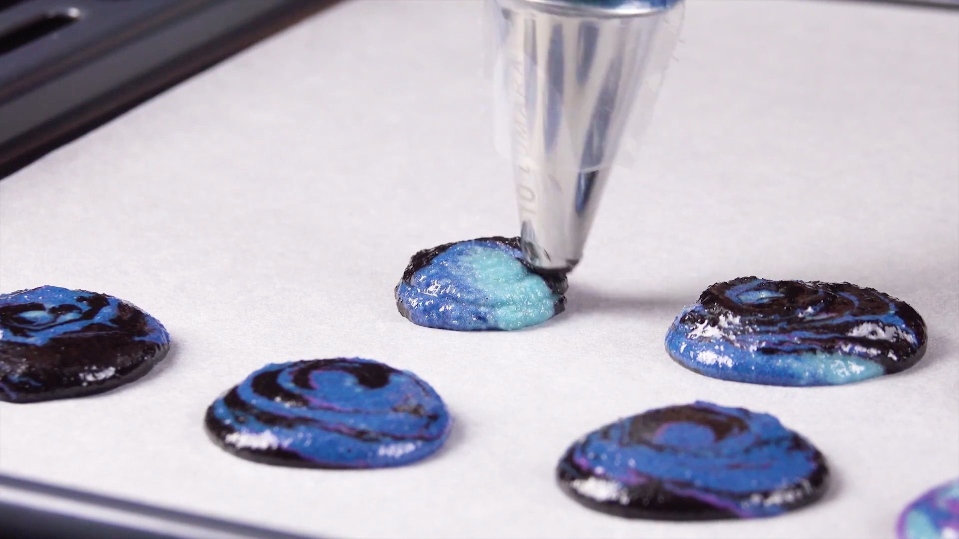 4.) Setze mit dem Spritzbeutel kleine Macarons auf ein mit Backpapier ausgelegtes Blech. Drehe dabei den Spritzbeutel jeweils in einer Spiralbewegung. Bei 150 °C Ober- und Unterhitze backst du die Macarons für 13 Minuten.