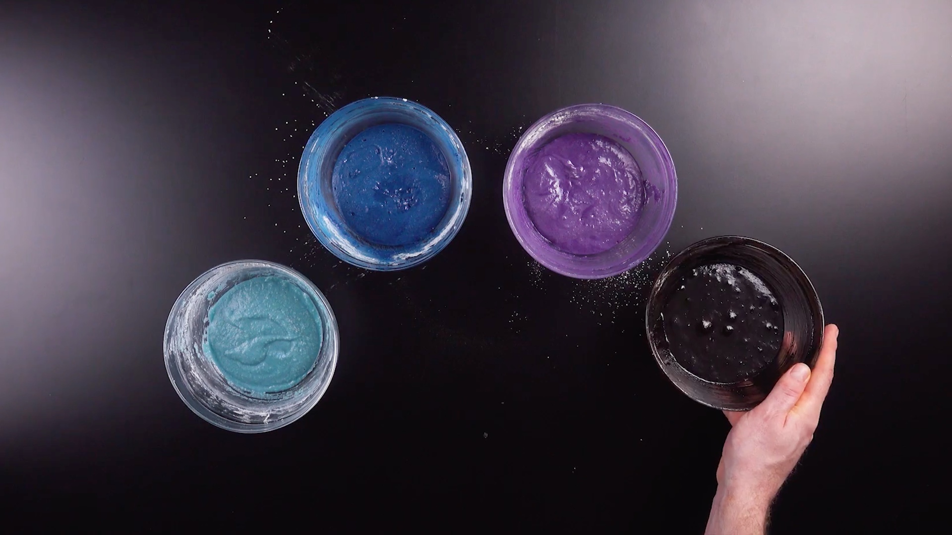 • Lebensmittelfarben in Blau, Lila, Schwarz und Weiß