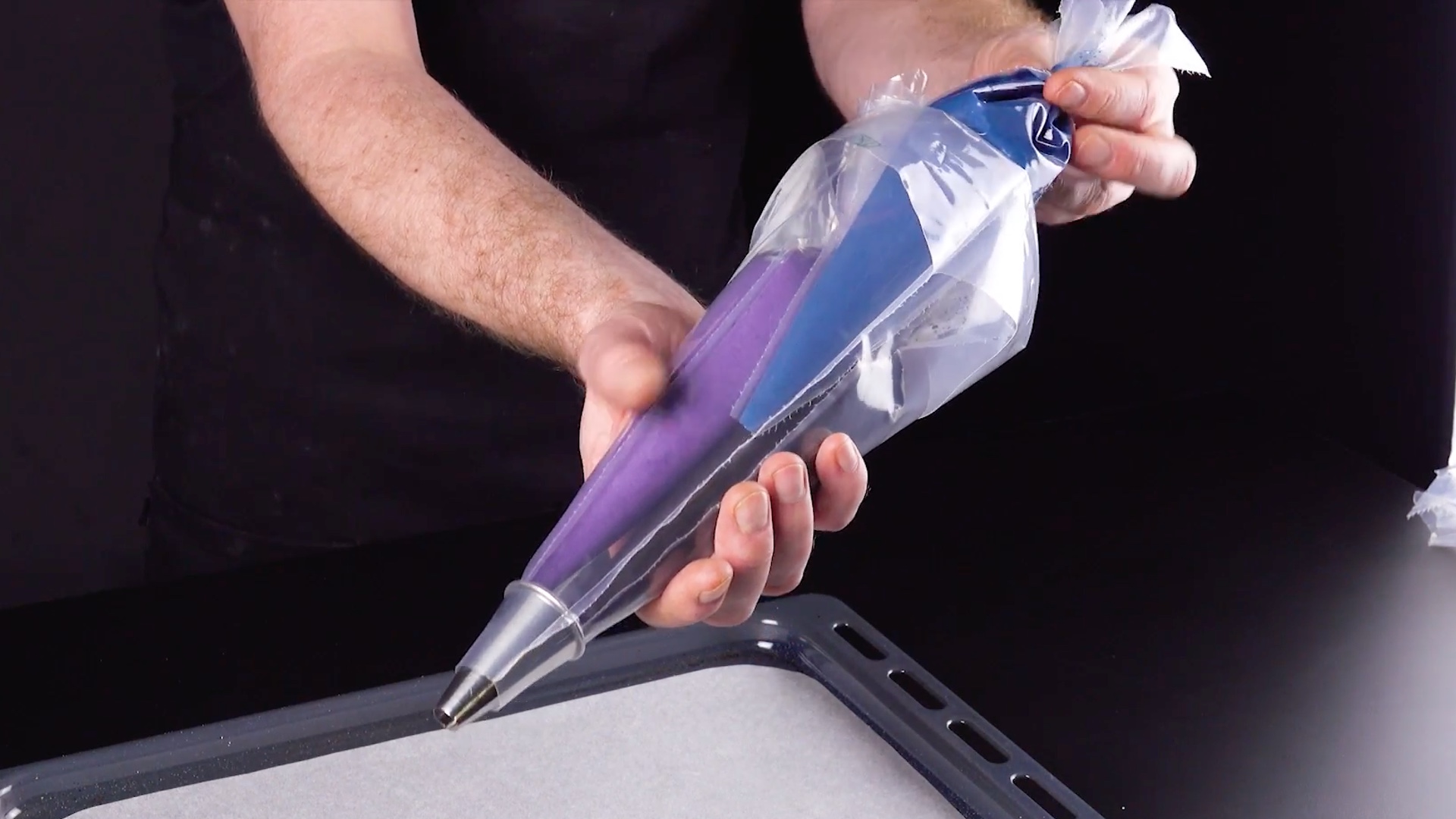 3.) Fülle jeden Teig in einzelne kleine Spritzbeutel ohne Tülle. Schneide die Spitzen ab und lege die kleinen Spritzbeutel gemeinsam in einen großen Spritzbeutel mit Tülle.