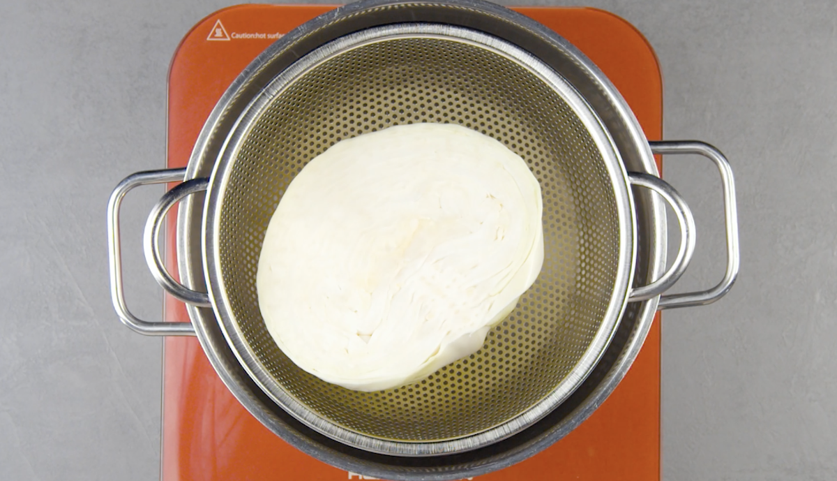 1. Halbiere den Weißkohl und dämpfe beide Hälften 10 Minuten.