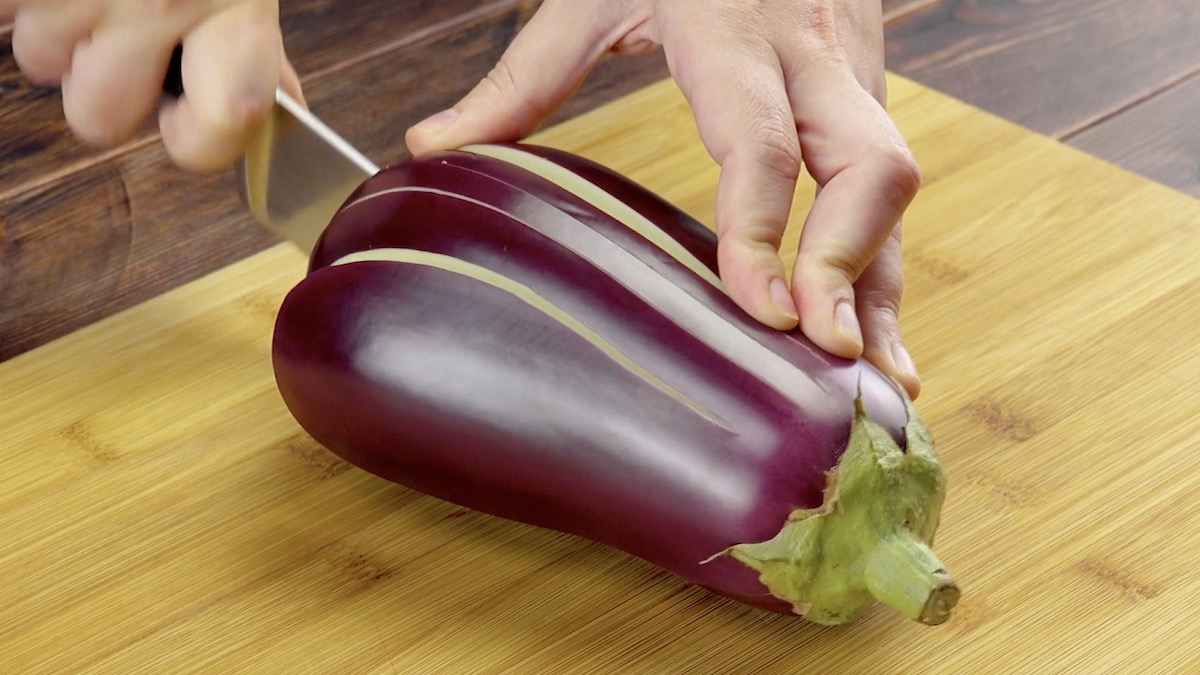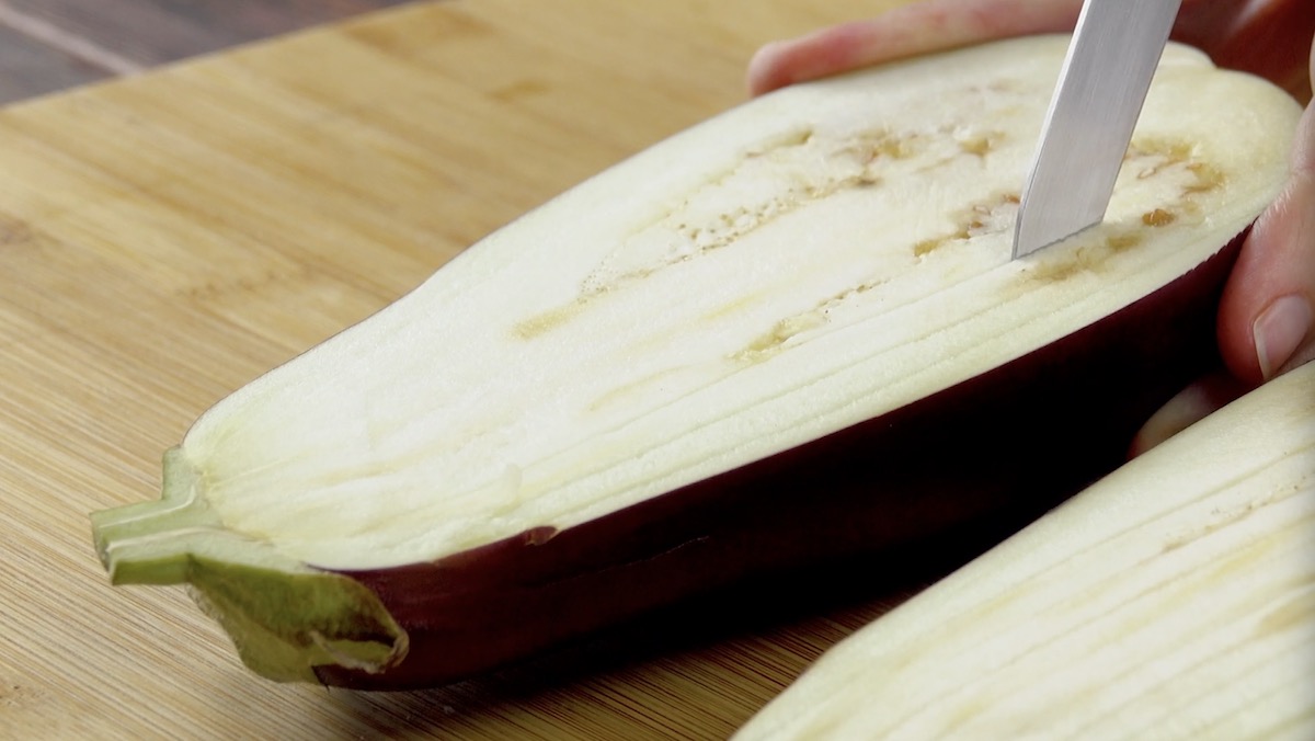 2.1) Halbiere die Aubergine und schneide sie anschließend der Länge nach mehrfach ein.