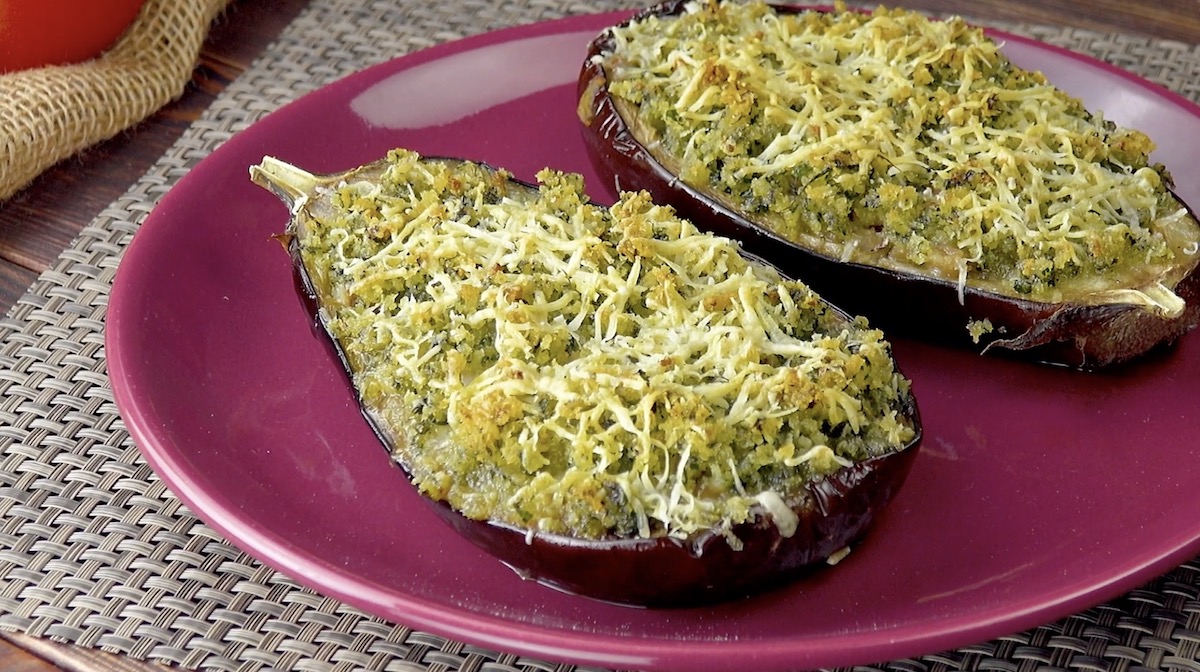 2.4) Verteile die Masse nun auf den Auberginenhälften. Beträufle das gefüllte Gemüse mit dem übrigen Olivenöl und bestreue es mit Parmesan. Nach 30 Minuten bei 180 °C im Umluftmodus kannst du die gefüllten Auberginen genießen. Guten Appetit!