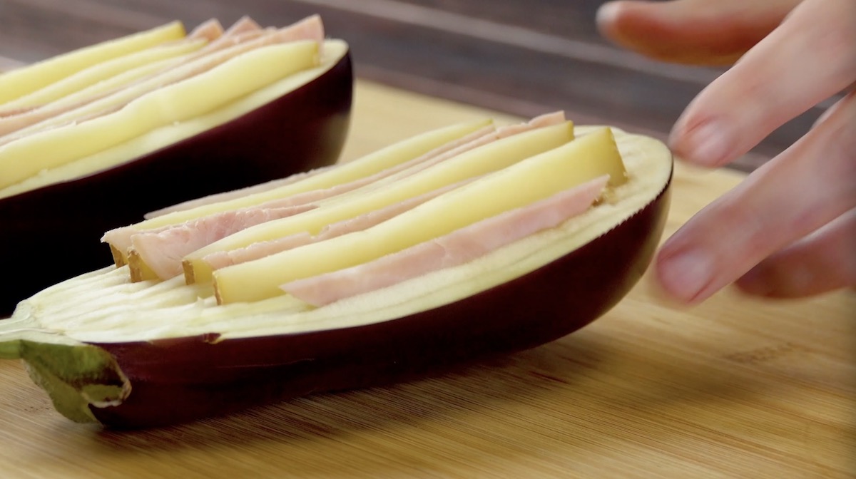 2.2) Scheide sowohl den Kochschinken als auch den Käse in Scheiben und stecke diese in die Einschnitte der Aubergine.
