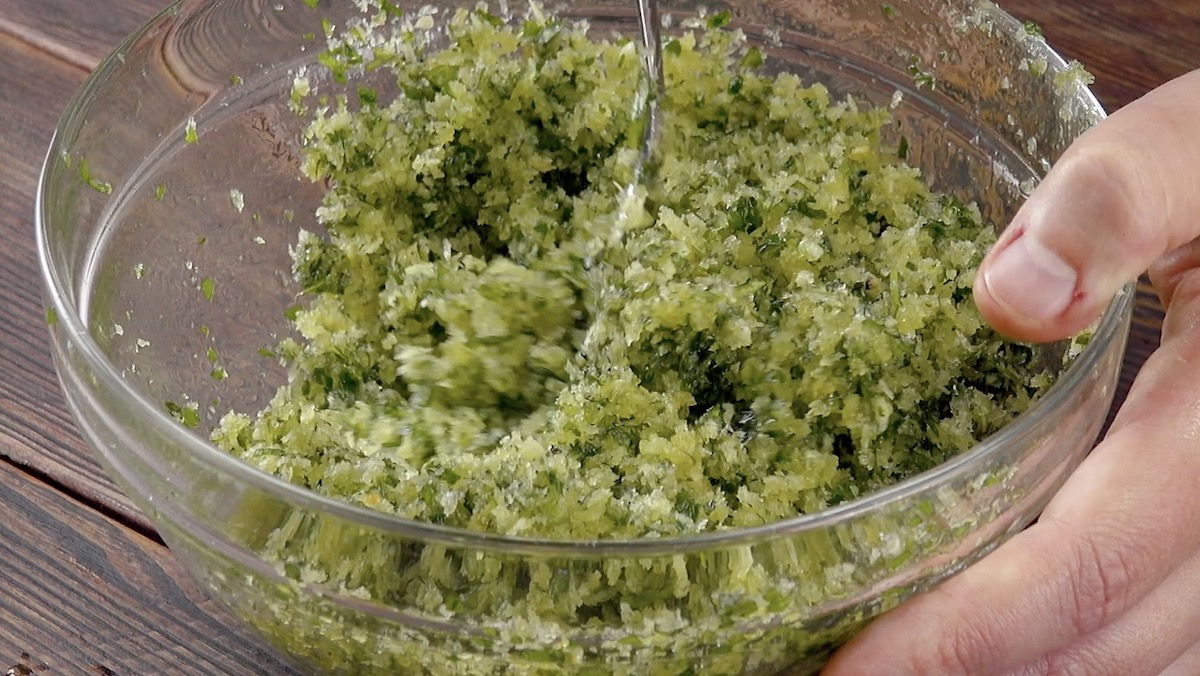 2.3) Hacke das Basilikum sowie die Knoblauchzehen klein und vermische sie mit dem Paniermehl und der Hälfte des Olivenöls. Würze das Ganze mit Salz und Pfeffer.