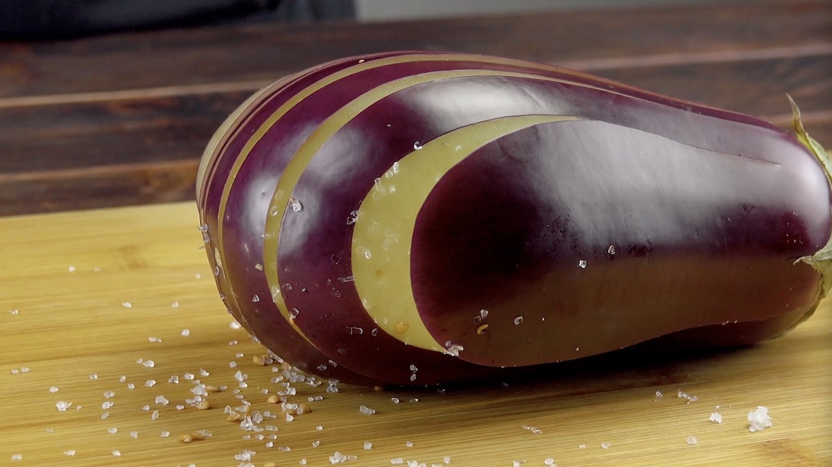 1.2) Bestreue nun die Schnittflächen mit Salz und lasse die Aubergine etwa 30 Minuten ruhen.